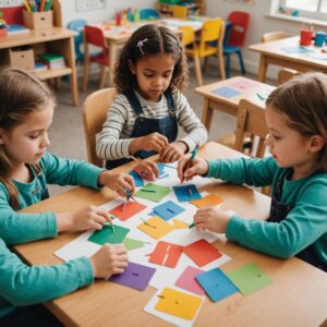 - Łączenie kolorowych kartek lub wstążek w długie łańcuchy jako ćwiczenie współpracy grupowej.